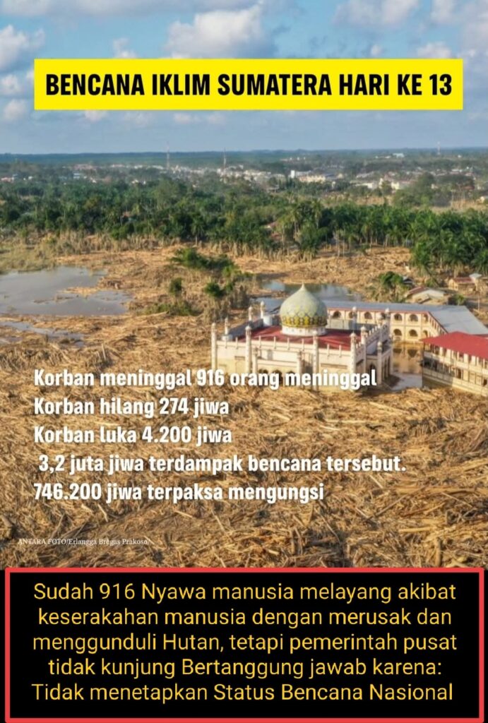 Menurutnya, alasan belum ditetapkannya status Bencana Nasional pada musibah yang terjadi di tiga provinsi di Sumatera sangat berkaitan dengan kepentingan para pemilik modal.